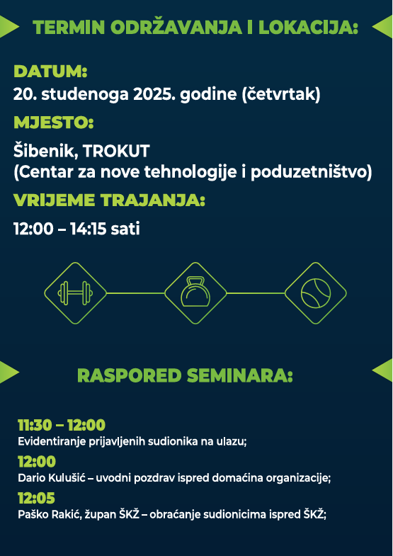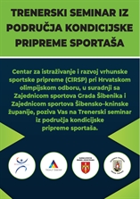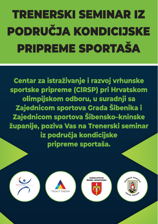 Centar za istraživanje i razvoj vrhunske sportske pripreme (CIRSP) pri Hrvatskom olimpijskom odboru, u suradnji sa Zajednicom sportova Grada Šibenika i Zajednicom sportova Šibensko–kninske županije, poziva Vas na Trenerski seminar iz područja kondicijske pripreme sportaša. , koji će se održati u Trokutu (Centar za nove tehnologije i poduzetništvo) u četvrtak, 20. studenog u 12 sati.