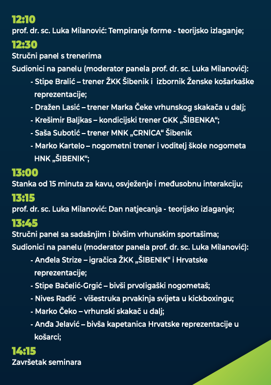 Seminar je koncipiran kroz dva panela u kojem, nakon prvog predavanja prof. Milanovića sudjeluju treneri iz Šibensko-kninske županije, a nakon drugog predavanja održat će se panel s bivšim i sadašnjim vrhunskim sportašima.